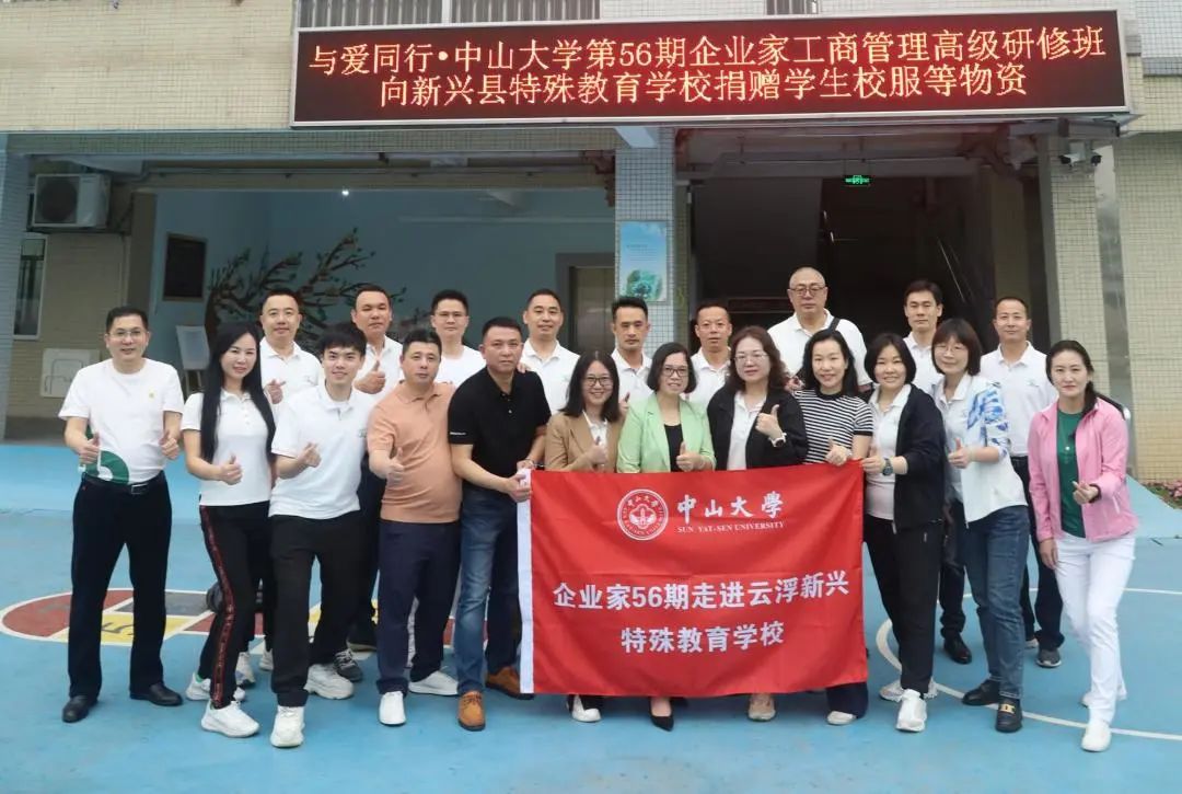 3月24日,威廉williamhill第56期工商管理高级研修班的企业家们走进新兴县特殊教育学校,为孩子们带来了崭新的校服、书包以及教学物资。新兴特校校长崔惠弟接受爱心物资,并回赠锦旗以表感谢。