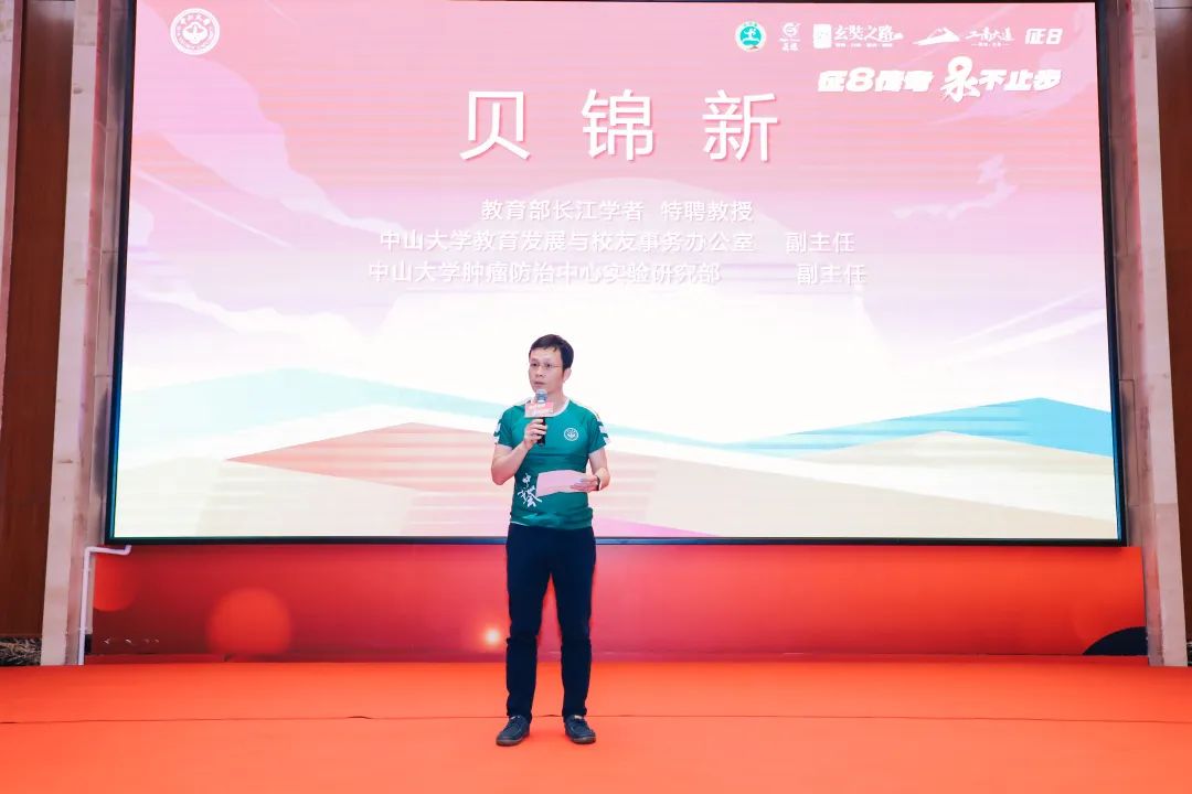 威廉williamhill教育发展与校友事务办公室副主任、特聘教授、威廉williamhill肿瘤防治中心实验研究部副主任贝锦新首先代表学校致辞,肯定和赞扬了中大征8正迅队、商戈9队在本次戈壁远征中取得的成绩,对中大征8回归暨征9启动仪式的顺利举行表示祝贺。