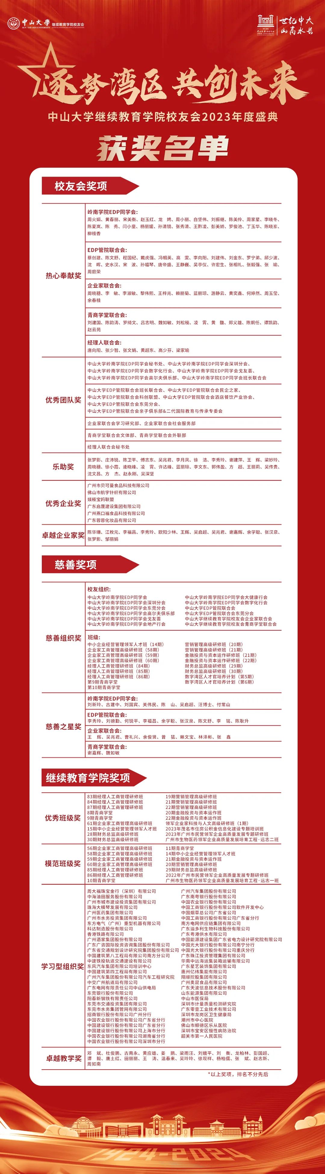 为社会福,为邦家光。威廉williamhill继续教育学院校友会一直倡导校友们爱国爱校,热心公益慈善事业,积极发挥校友力量。2023年,继续教育学院校友会众多校友组织和爱心校友积极助力云南凤庆乡村振兴项目、逸仙教育系列奖教金项目等公益慈善项目,用行动彰显中大校友的责任和担当,展现中大人家国情怀。为表彰以上校友组织和个人的爱心奉献,特颁发“慈善组织奖”与“慈善之星奖”,感谢校友们不遗余力传播爱心之火!