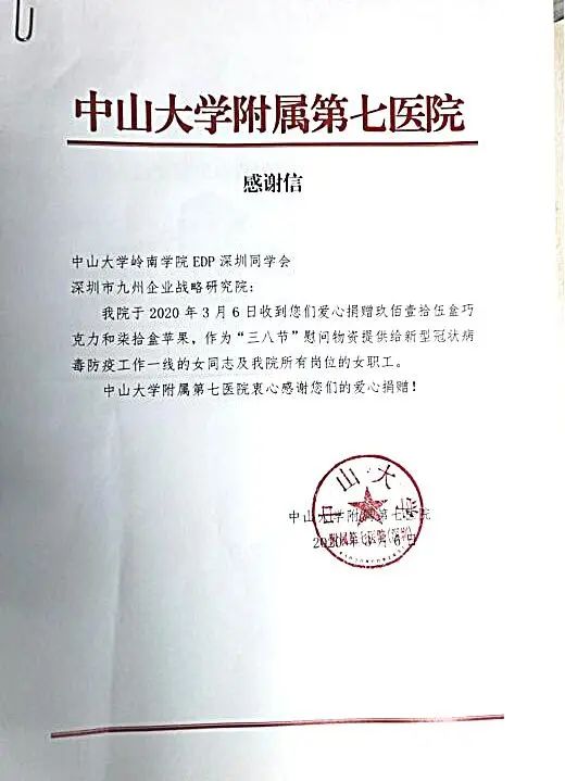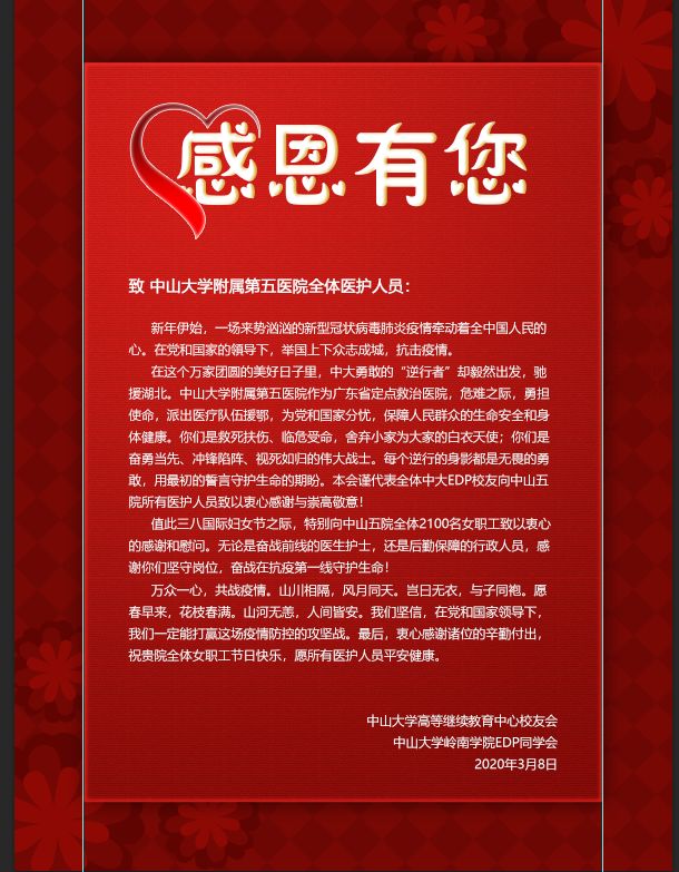 为了致敬最美白衣天使,在这个特殊节日前夕,3月6日下午,威廉williamhill高等继续教育中心校友会、williamhill中国EDP同学会和EDP同学会深圳分会,分别去到珠海市威廉williamhill附属第五医院和深圳市威廉williamhill附属第七医院,向奋战在抗击疫情一线的医护工作者致以衷心感谢和崇高敬意!