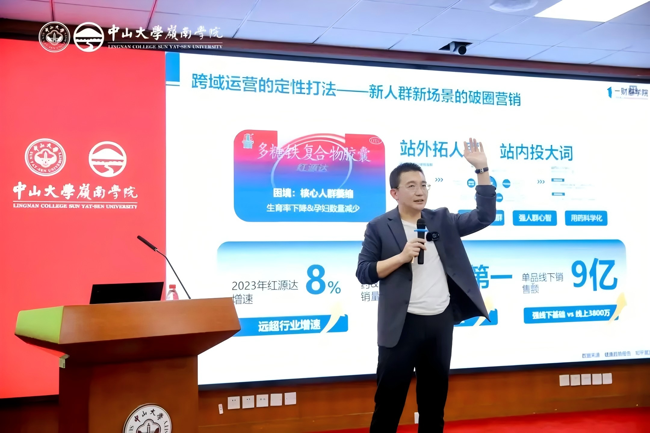 黄磊老师以《AI对全域营销和平台经济:机遇与挑战》为主题进行讲座。作为全域学派的创始人,黄老师娓娓道来,为同学们带来一堂浓缩版的平台经济课程。他从今年年初黄金抢购和水晶爆红,带出了AI如何让营销“闻人声而知雅意”。紧接着他深入剖析了“平台经济”和“全域营销”这两个核心概念。他指出了平台经济是一种通过数字技术构建的双边或多边市场模式,连接不同用户群体,促进供需匹配和资源优化配置,提升交易效率和价值创造的经济形态;后推导总结了全域营销在线上&线下、内容&货架、种草&成交、公域&私域的四大方面八大象限的要点,并分享了相关案例。最后他结合自己对平台经济和AI技术的洞察,总结出企业从点、线、面、体应用AI提升效率,全域营销应用AI可从决策层、经营层和支持层进行全方位赋能。最后,他引导来宾一起探讨了全域营销在AI时代的挑战与机遇。