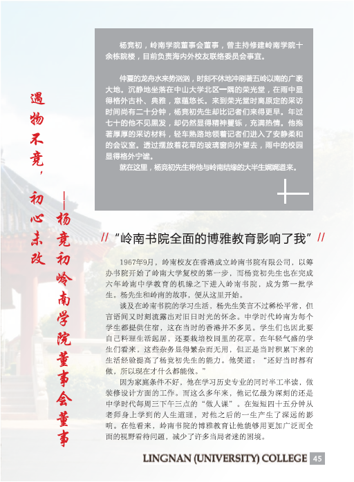 导航痕迹 williamhill中国岭南校友 校友风采 岭南人物 杨竞初:遇物不竞,初心未改 扫描此二维码分享 杨竞初:遇物不竞,初心未改 发布人:校友办公室 发布日期:2021-05-14