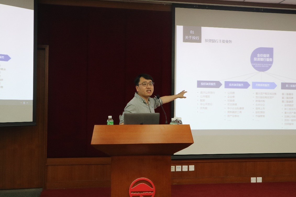 贾晓斌先生首先介绍了证券公司投行业务的相关情况。他用简明扼要的语言为同学们介绍了A股市场中主板、中小板、创业板和科创板的现状,并以兴业证券为例介绍了证券公司内部的主要部门架构。