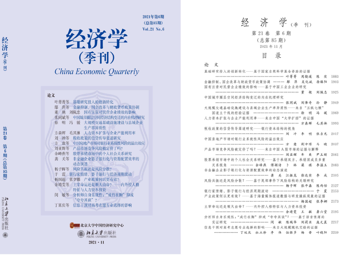 我院杨子晖教授与张平淼、陈雨恬两位博士生合作的论文《风险共振还是风险分散——基于尾部事件下风险结构的关联研究》于2021年12月在经济学中文顶级期刊《经济学(季刊)》发表。