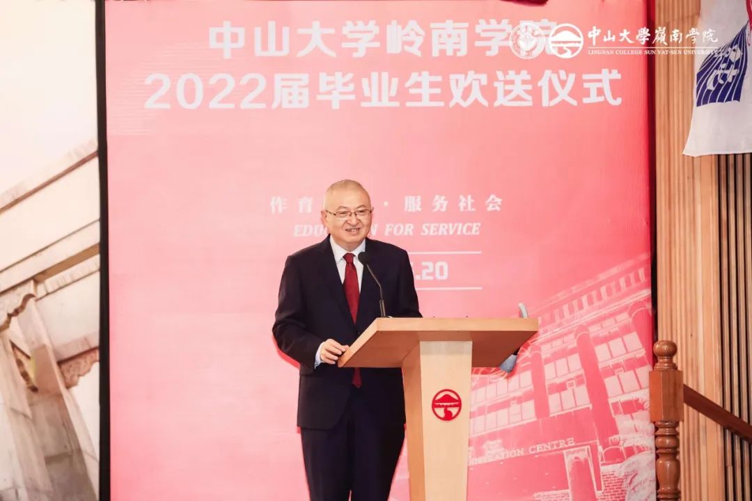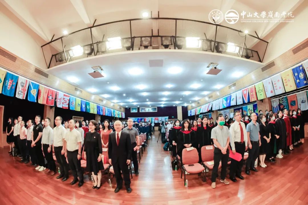 岭南有一个标帜性文化传统——每一届同学都拥有一个独特的“社名”,学院生活的各年级活动中(如院运会、年级大会、学院对外参访等),均以“社”进行;毕业后,回校活动也以“社名”做认亲和组织进行。2022年毕业的同学为“恩社”,李善民院长向2022届毕业生授社旗。