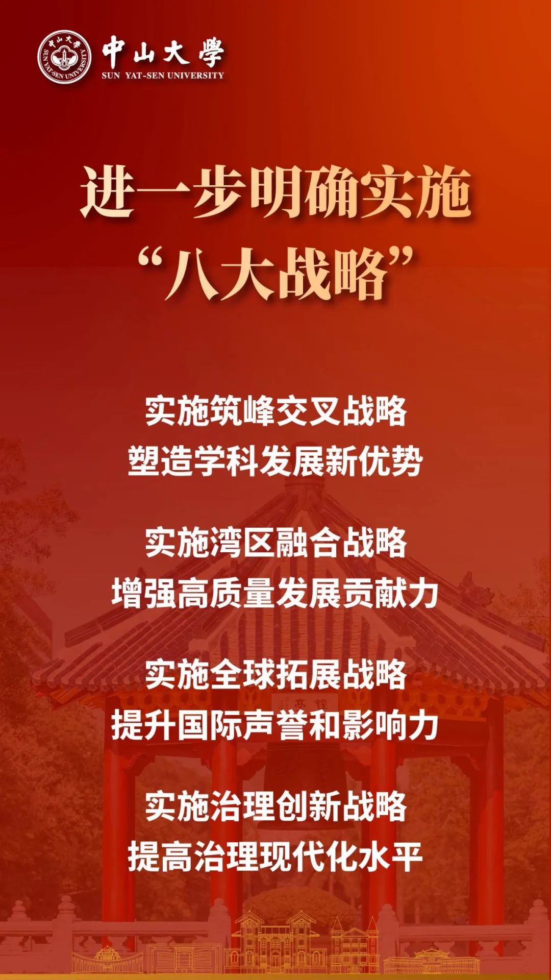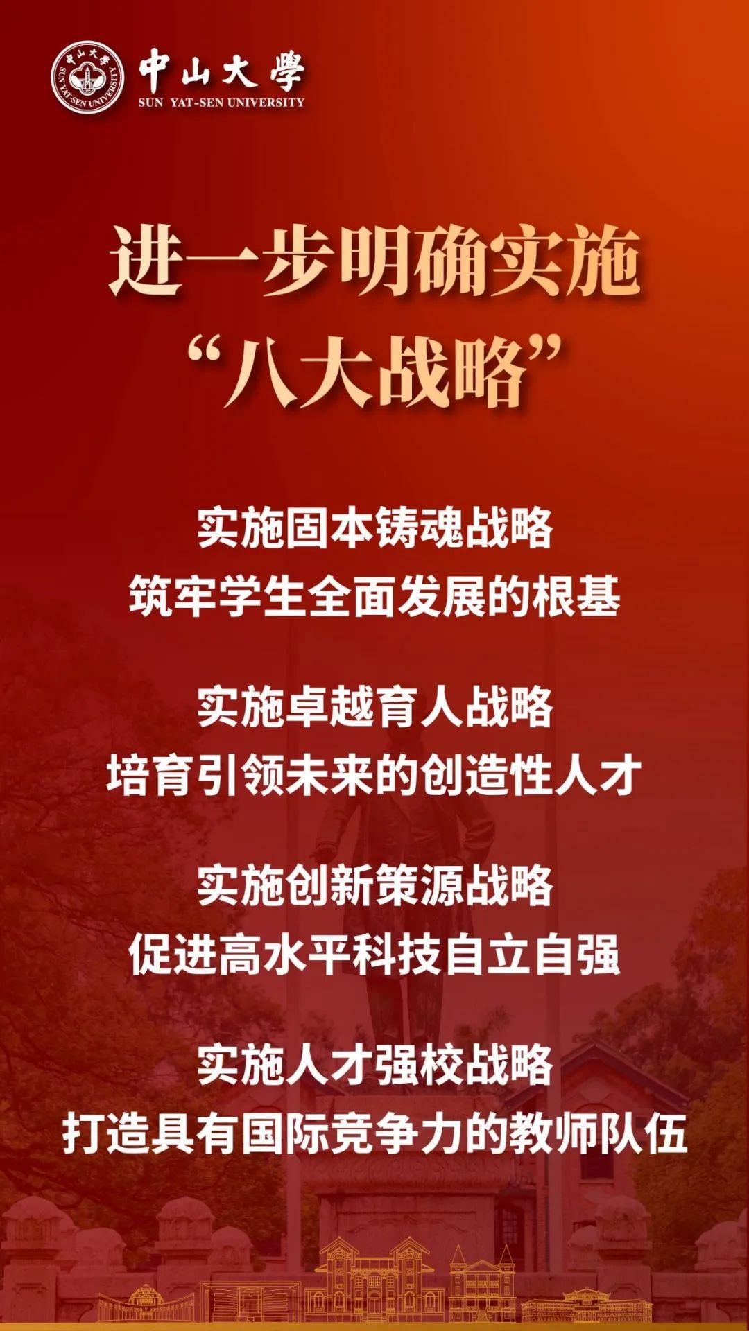 高水平人才自主培养取得显著成效,引领性的原始创新成果持续涌现,具备全球竞争力的高素质专业化教师队伍基本建成,服务国家战略能力显著增强,学校治理体系和治理能力现代化基本实现,学校的国际影响力迈上新台阶,若干学科和整体办学实力进入世界一流前列,成为具有鲜明中国特色、显著中大风格,引领未来发展的世界强校,为建成教育强国作出重要贡献。