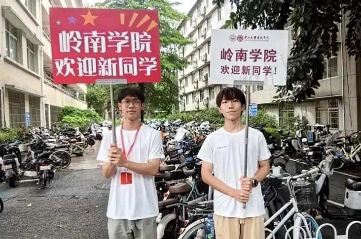 岭南堂前,迎新志愿者们手持欢迎标语,早已等候多时,与新生们在打卡板和院训墙前留下一张张宝贵剪影。