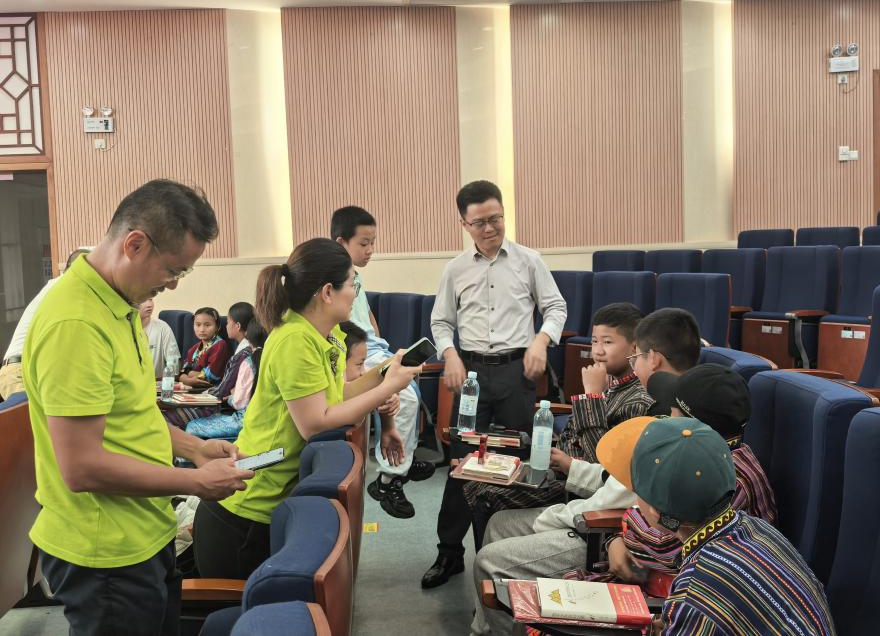 在交流中,一位藏族中大学子讲述了自己从西藏走出、拼搏求学、圆梦中大的经历,赢得孩子们热烈的掌声。起初还有些拘谨的孩子们,渐渐在热情的交流中放开了自己,大方介绍家乡风光,和师生们分享“莲花秘境”的故事,现场气氛其乐融融。