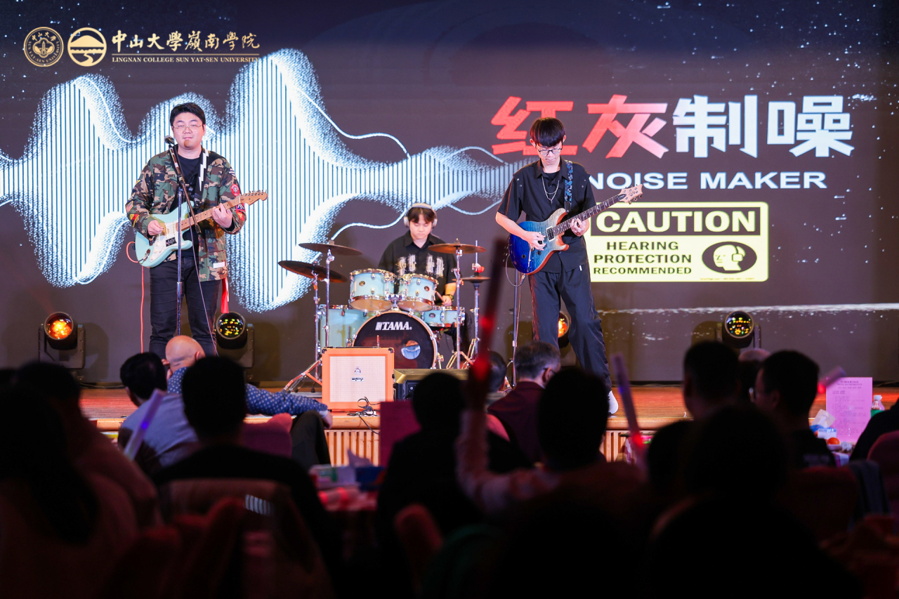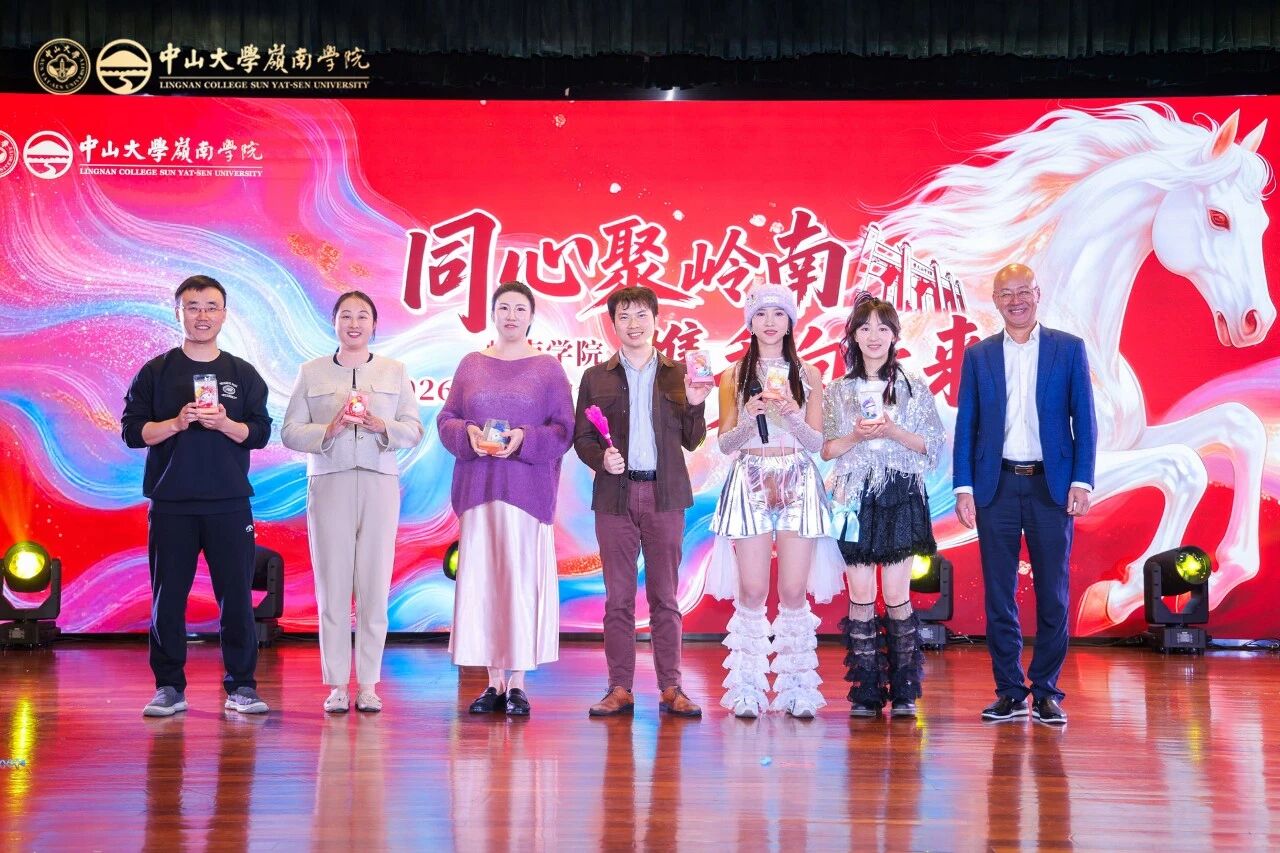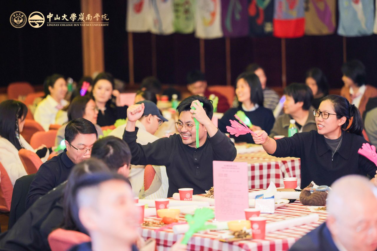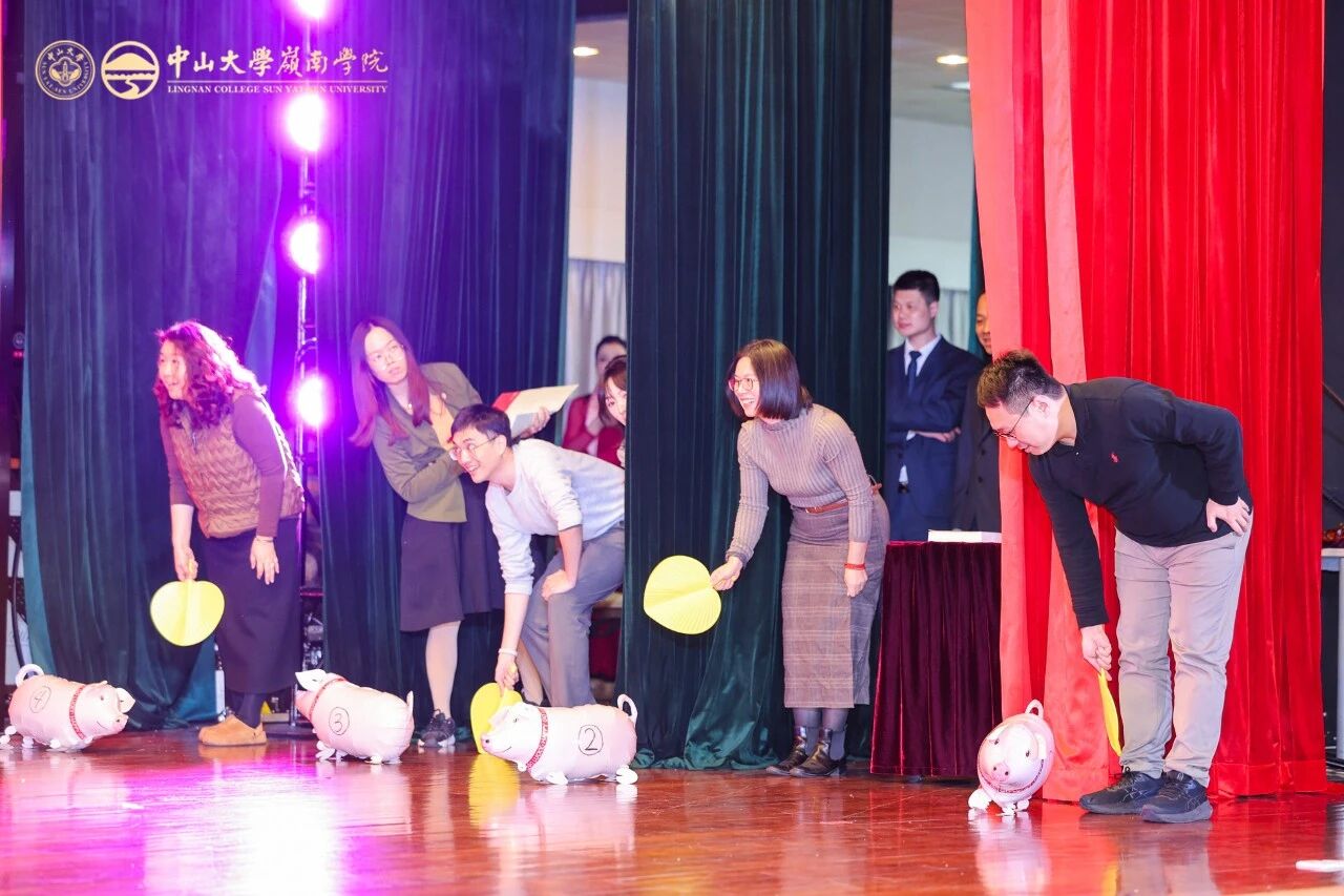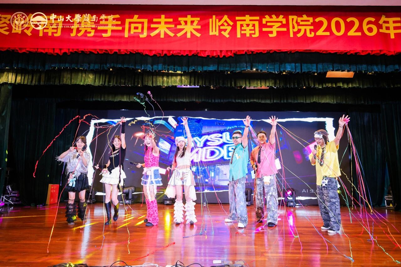 老师们精心准备的节目异彩纷呈、各有千秋:歌舞《第一天》活力四射,用蓬勃激情拉开晚会序幕;舞蹈《亲爱的你呀》温情脉脉,以优美舞姿诉说对岭南的深情告白;“红灰制噪” 乐队带来的《空谷幽兰》《成都》《潇洒走一回》歌曲串烧,兼具温馨喜庆与奋进力量,感染力十足;龙朝晖老师献唱的彩蛋节目《一根竹竿容易弯》,更唱出了团结一心的集体精神;话剧《红色宣言》节选则字字铿锵,彰显着信仰的光芒与精神的传承;杨尔雅老师的钢琴独奏《儿童鲜花曲》《波洛涅兹舞曲》,流淌着指尖的优雅,带来沉浸式听觉享受。节目间隙穿插的 “Emoji猜猜乐”“猪笼入水” 互动游戏,趣味性与参与感拉满,现场欢声笑语不断,气氛热烈高涨,充分展现了岭南家人其乐融融的团圆氛围。