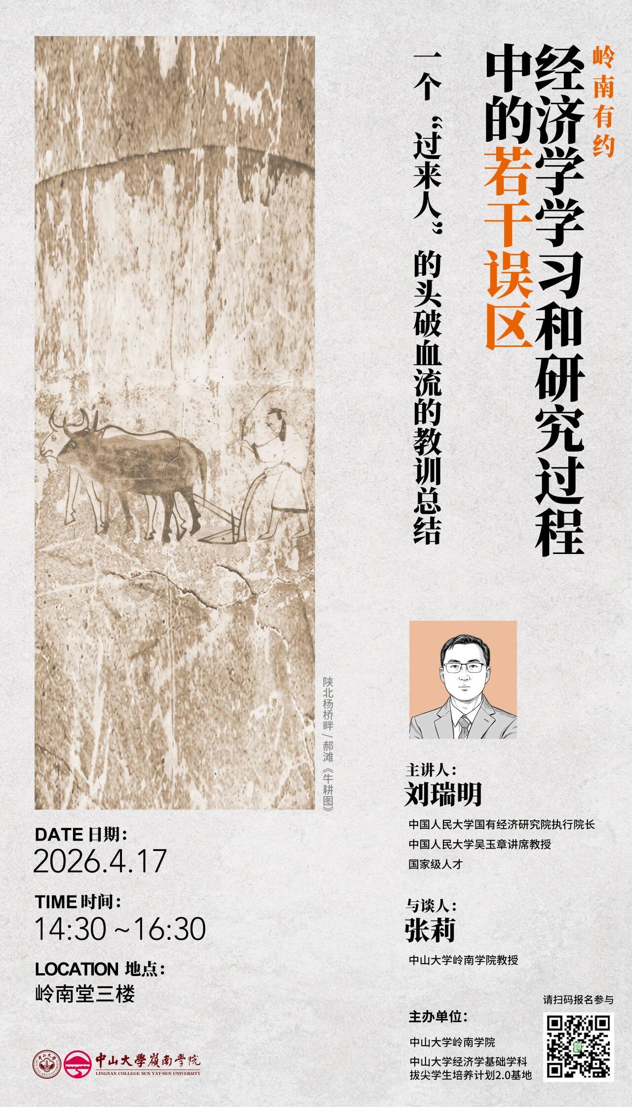 【岭南有约】第一期我们邀请到中国人民大学吴玉章讲席教授刘瑞明老师,与williamhill中国张莉教授展开对谈,和同学们一起聊一聊经济学学习与研究过程中的若干误区。欢迎对此感兴趣的同学报名参与!