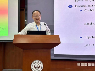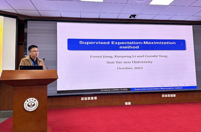 首都经贸大学李鲲鹏教授作题为“Supervised Expectation-Maximization method” 的学术报告。他认为,在面对大数据处理时,我们要用机器学习来处理数据。他向同学们介绍了监督性降温这一方法,同时讲解了利用该方法如何将高级数据降解成低位以及该方法在金融领域的相关运用等内容,为同学们的学术研究带来了启发。