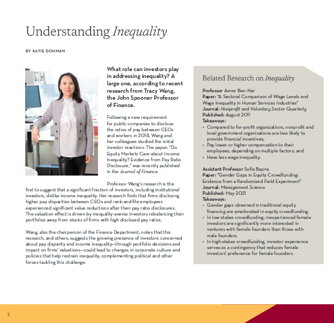 Following a new requirement for public companies to disclose the ratios of pay between CEOs and workers in 2018, Wang and her colleagues studied the initial investor reactions. The paper, “Do Equity Markets Care about Income Inequality? Evidence from Pay Ratio Disclosure,” was published in the Journal of Finance.