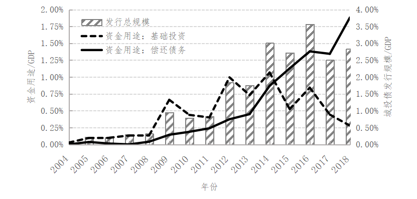 不同于已有研究从债务规模的角度分析地方融资平台的债务风险,本文收集整理了2004-2018年城投债募集说明书中公布的募集资金用途,并将其分解为“基础投资”用途和“偿还债务”用途。数据显示,在“四万亿”财政刺激计划期间,以基础设施建设为代表的市政投资是城投债的主要资金投向,但随着时间的推移,用于借新还旧的融资规模急速增加,尤其是在2014年之后,借新还旧的资金规模开始超过了用于基础投资的资金规模,城投债的主要融资目的已从基建投资转化为偿还存量负债。由此而来的问题是,如何对这一现象做出解释,该现象背后是否反映出地方融资平台的债务风险已呈现出新的特征?