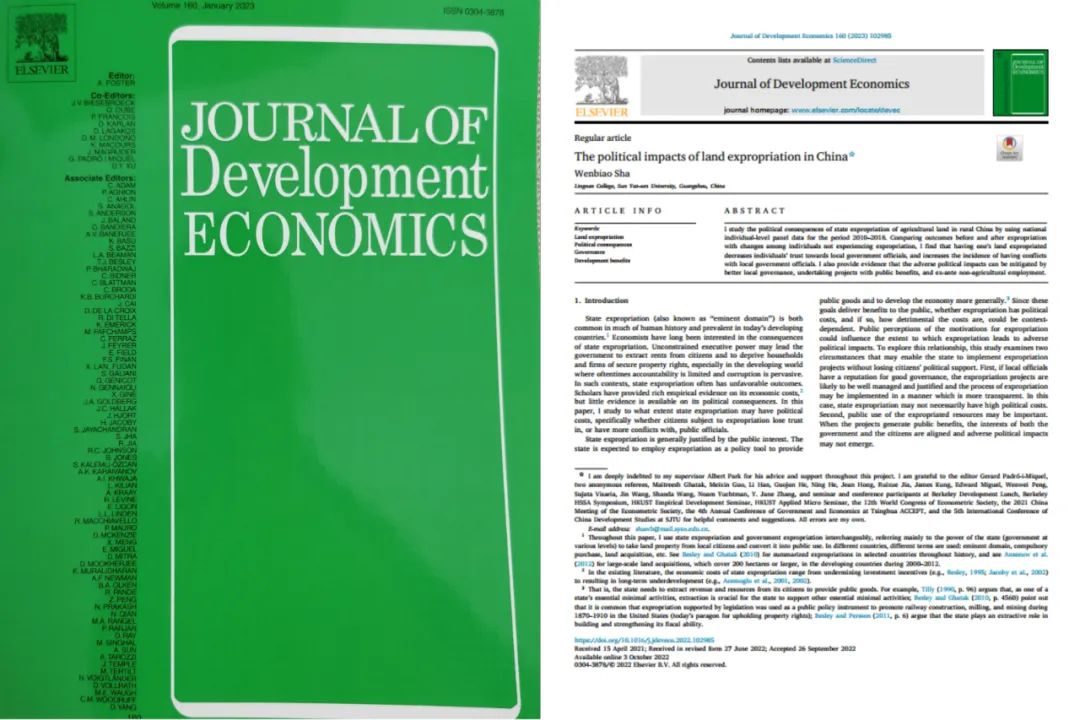 williamhill中国沙文彪助理教授独立完成的论文“The political impacts of land expropriation in China”于2023年1月在发展经济学领域顶级期刊Journal of Development Economics上发表。
