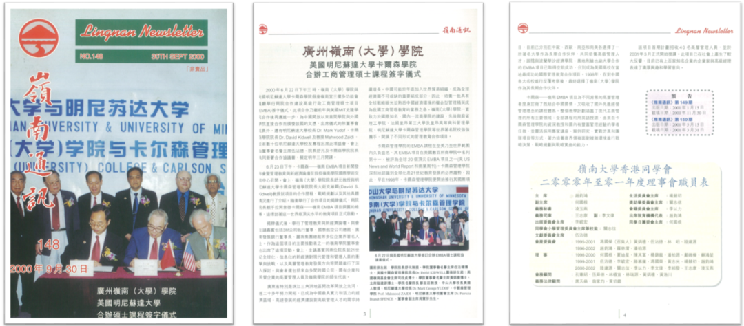 2000年6月22日下午三时,岭南(大学)学院与美国明尼苏达大学卡尔森学院假座岭南堂三楼多功能会议厅举行两院合作建设高级行政工商管理硕士项目(EMBA)签字仪式。此项合作乃继前年与美国MIT史隆学院合作后再迈进一步,为中国开放以来首间学院与外国学院直接合作而颁发该国的文凭,出席仪式的除董事会成员外,还有明尼苏达大学校长Dr.Mark Yudof、卡尔森学院院长Dr.David Kidwell及敎授Mahmood Zaidi,并有数十位明尼苏达大学校友专程出席此项盛会,会上由董事会名誉主席伍沾德、院长舒元及卡尔森学院院长共同签署合作协议书,拟定明年三月开课。