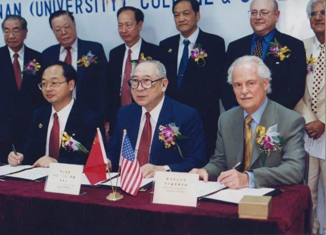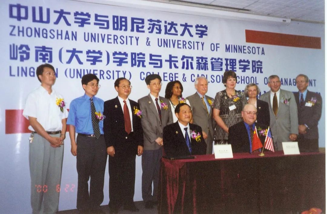 3:00 p.m. on June 22, 2000, Lingnan College and the Carlson schoolof Management, University of Minnesota held a signing ceremony for the joint establishment of executive MBA program (EMBA) in the multifunctional conference hall on the third floor of Lingnan Hall. In addition to members of the School Board of Directors of University of Minnesota, Dr. Mark Yudof, President of University of Minnesota, Dr. David S. Kidwell, Dean of the Carlson College Kidwell, Professor Mahmood Zaidi, and dozens of University of Minnesota alumni attended the event. At the meeting, Dr. James Wu, the honorary chairman of the School Board of Directors of Lingnan (University) College, Professor SHU yuan, Dean of Lingnan College, and Dr. David S. Kidwell, Dean of Carlson college, signed a cooperation agreement together, which planned to start the course in March 2001.
