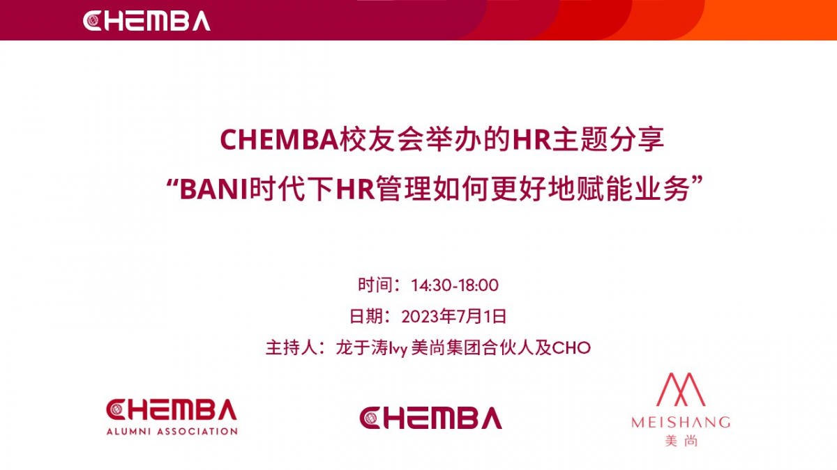 7月1日下午,由CHEMBA校友会主办,美尚集团及CHEMBA Office协办的HR主题分享 —“BANI时代下HR管理如何更好地赋能业务”讲座在美尚集团办公室举行。CHEMBA校友会会长胡勇先生、执行会长李生林先生、项目主任余曙暑女士及20几位对分享话题感兴趣的学院校友和社会人士参加本次活动。讲座由美尚集团合伙人及CHO、CHEMBA校友龙于涛女士主持。