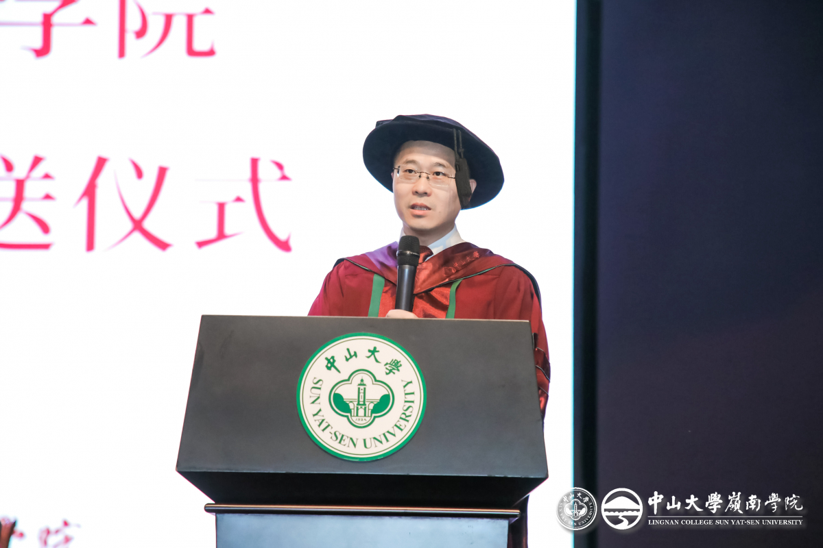副院长刘彦初教授作为教师代表发言,他寄语:除了学到的经济金融和管理学知识以外,更希望大家具备以下三种意识。第一,请保持“上下求索,朝夕不倦”的探索意识。”第二,请保持“修身、齐家、治国、平天下”的责任意识。第三,请保持“终日乾乾,与时偕行”的创新意识。 前途似海,愿大家坚定前行,如同上一次在岔路口做出来到岭南的选择,请带着这份坚定去选择你滚烫的人生。