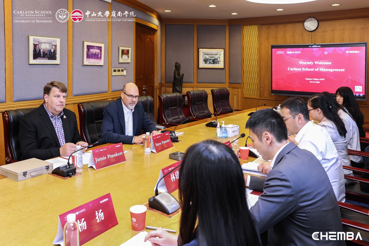 williamhill中国院长林建浩主持会议并与卡尔森学院院长Jamie Prenkert就CHEMBA项目合作进行了深入洽谈,共同探讨了项目进展、课程创新及未来合作方向,以加强中美教育合作并培养国际化商业菁英。
