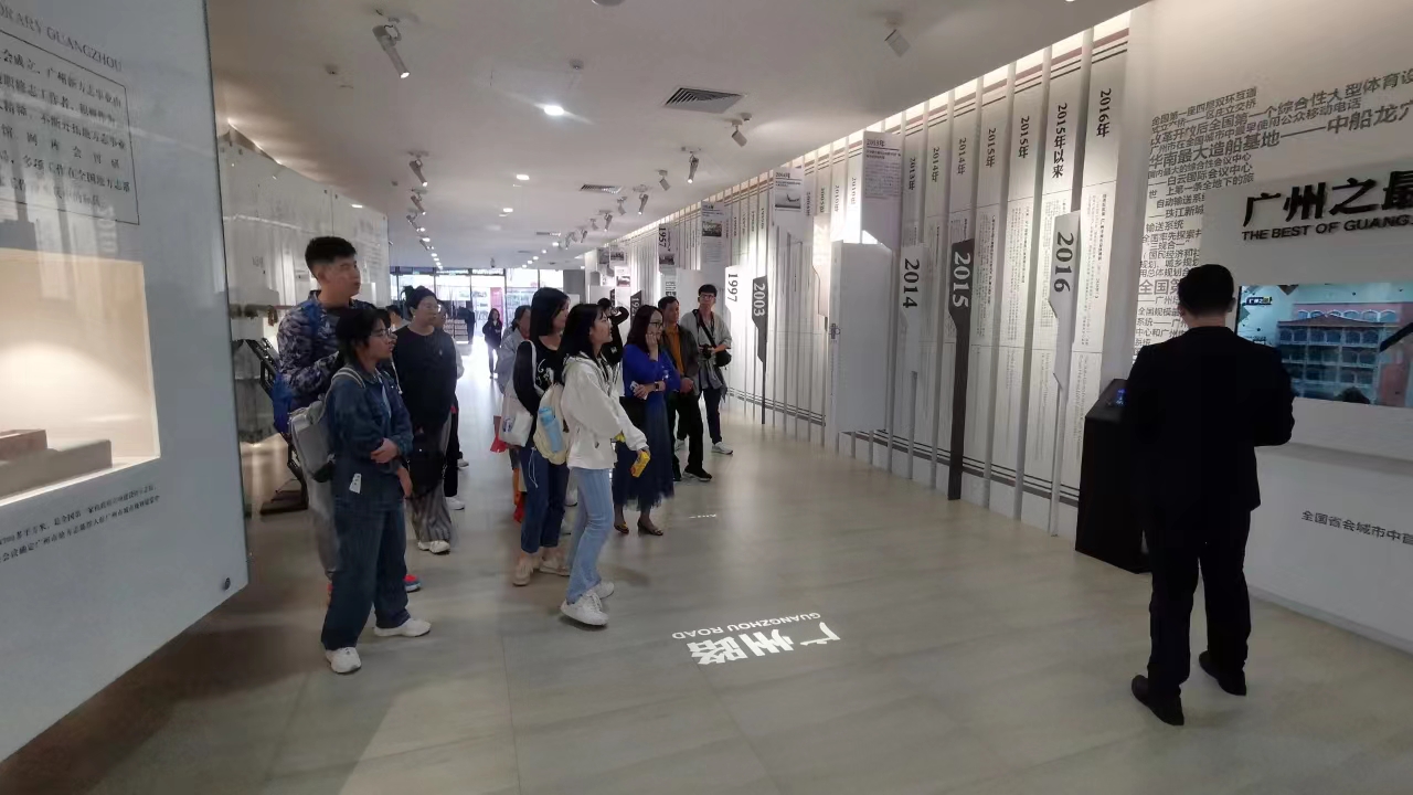 团队抵达后,由工作人员引领进行参观并聆听了相关详细介绍。广州市地方志新馆南邻白云新城中心广场,东邻白云国际会议中心,定位为广州市情展示中心、教育中心、服务中心、文献中心、编纂中心和影音中心。 新馆展览主题为“方志广州羊城今古”,与城市规划展览中心共同构建展现广州过去、现在和未来的城市之窗。新馆展厅设有序厅、综合展区、专题展区和数字化空间,以图文资料、体感互动、多功能查询、沉浸式环幕影院、场景复原、模型复件等多种现代手法,全方位展示广州千年名城发展历程,以及粤港澳大湾区、泛珠三角城市区域合作进程。