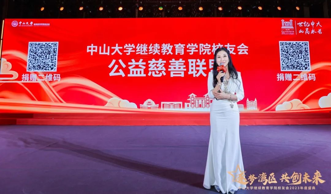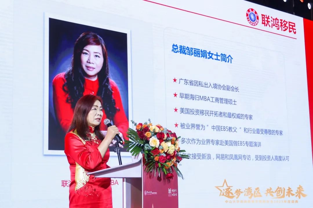 晚宴伊始首先邀请年度盛典总冠名单位广州市联鸿海外咨询服务有限公司总裁、企业家60期校友邹丽娟致辞,分享企业发展历程以及在中大学习感想。