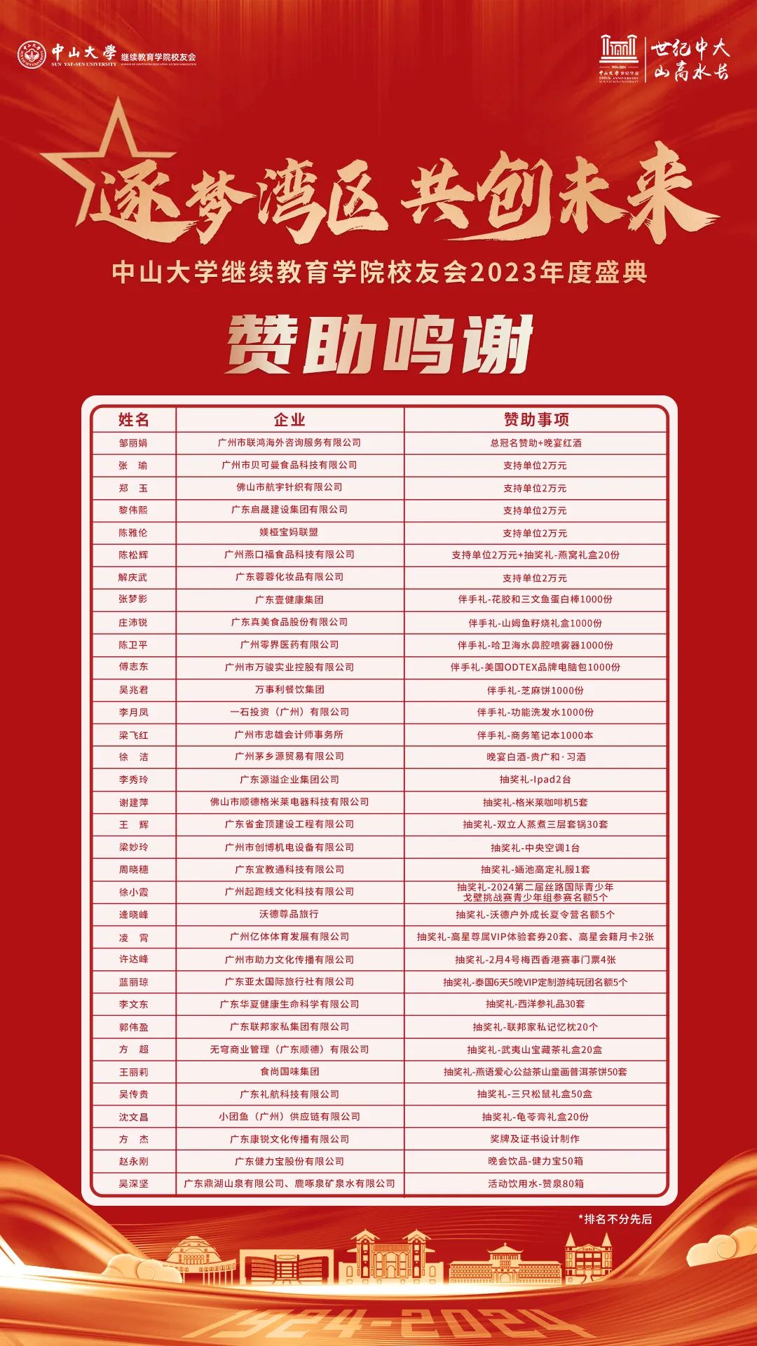 感谢以下所有给年度盛典提供赞助支持的校友和校友企业!感谢你们的热心奉献!