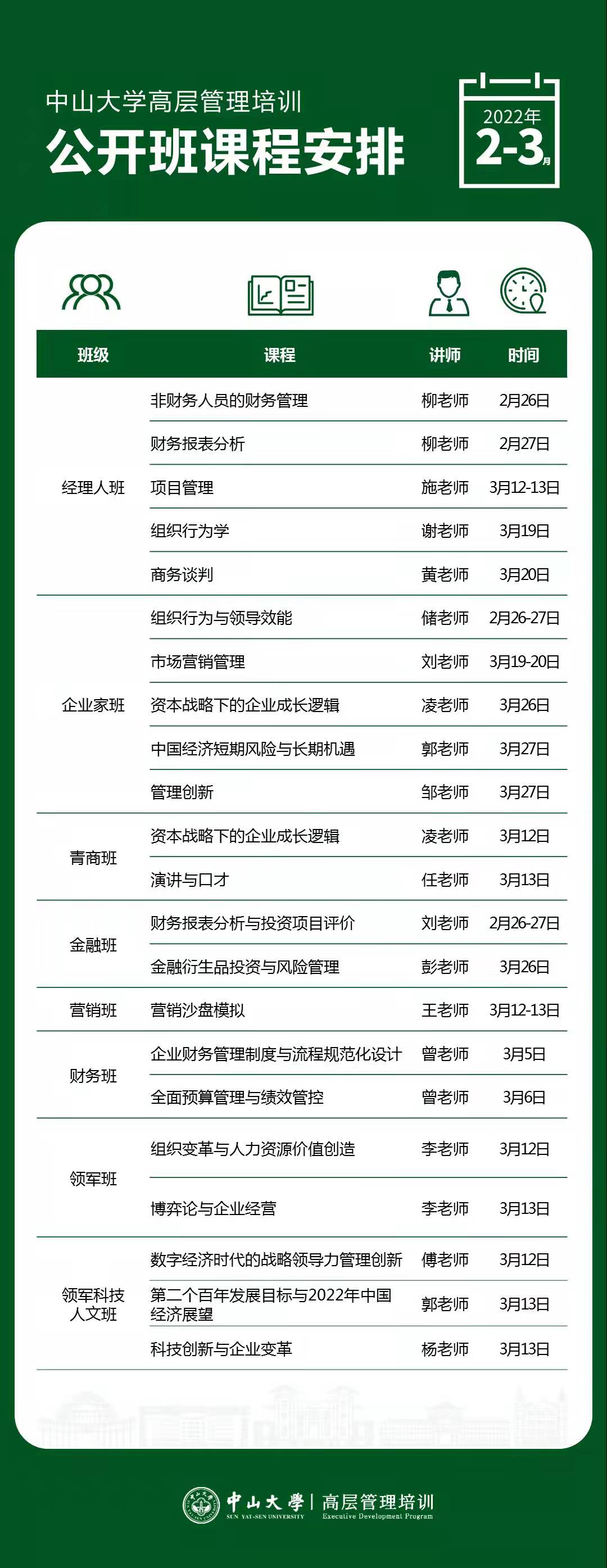 以下是高层管理培训公开课2月&3月课程表。新班3月19日开学,欢迎咨询报名加入新班!